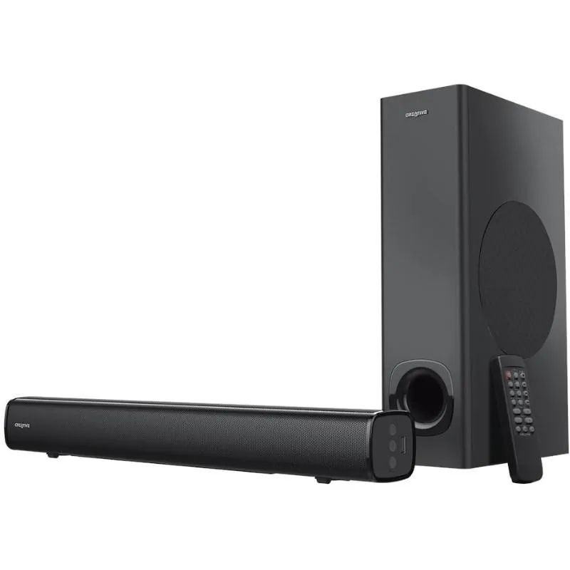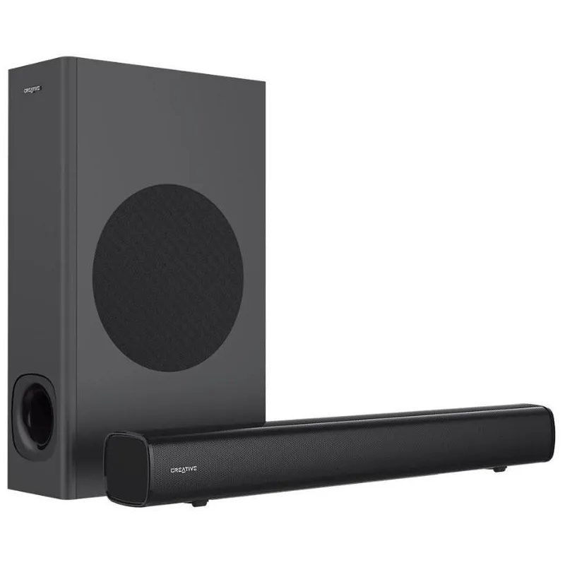 CREATIVE STAGE: Barra de sonido 2.1 de alto rendimiento para colocar debajo del monitor con subwoofer para TV, ordenadores y monitores ultra anchos.