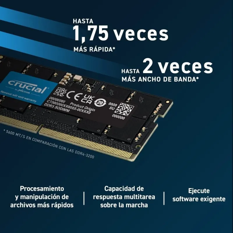 TIEMPOS DE CARGA Y TRANSFERENCIAS DE ARCHIVOS MÁS RÁPIDOS: La memoria de escritorio Crucial DDR5 puede capacitar a tu computadora para transferir un 50% más de datos que DDR4 en su lanzamiento, lo que resulta en tiempos de carga más rápidos, transferencias de archivos, descargas, tasas de refresco y menos tiempo de retraso. Debido a una mayor eficiencia del bus, la tecnología DDR5 no solo es más rápida que la generación anterior, es mejor.