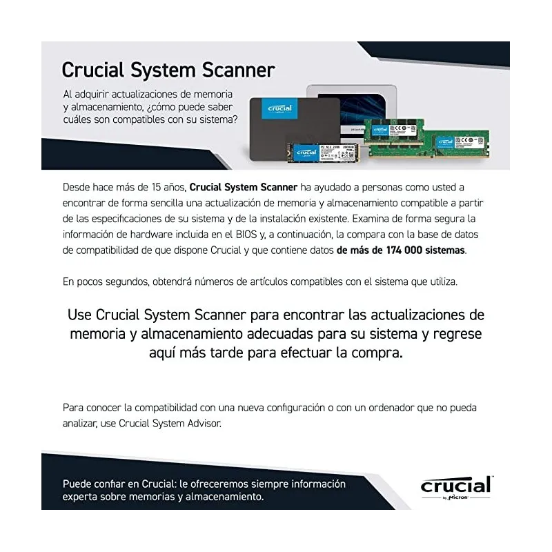 CALIDAD MICRON®: un mayor nivel de fiabilidad. Como marca Micron, uno de los mayores fabricantes de memorias del mundo, la memoria de sobremesa de Crucial es el estándar para un rendimiento fiable. Partiendo de la tecnología SDRAM original hasta llegar a DDR4, hemos creado las tecnologías de memoria que han dado potencia a los ordenadores del mundo durante 40 años y seguimos sumando. Al elegir la memoria Crucial, está eligiendo una memoria respaldada por una garantía de por vida limitada y diseñada para los principales sistemas del mundo. No se conforme con menos.