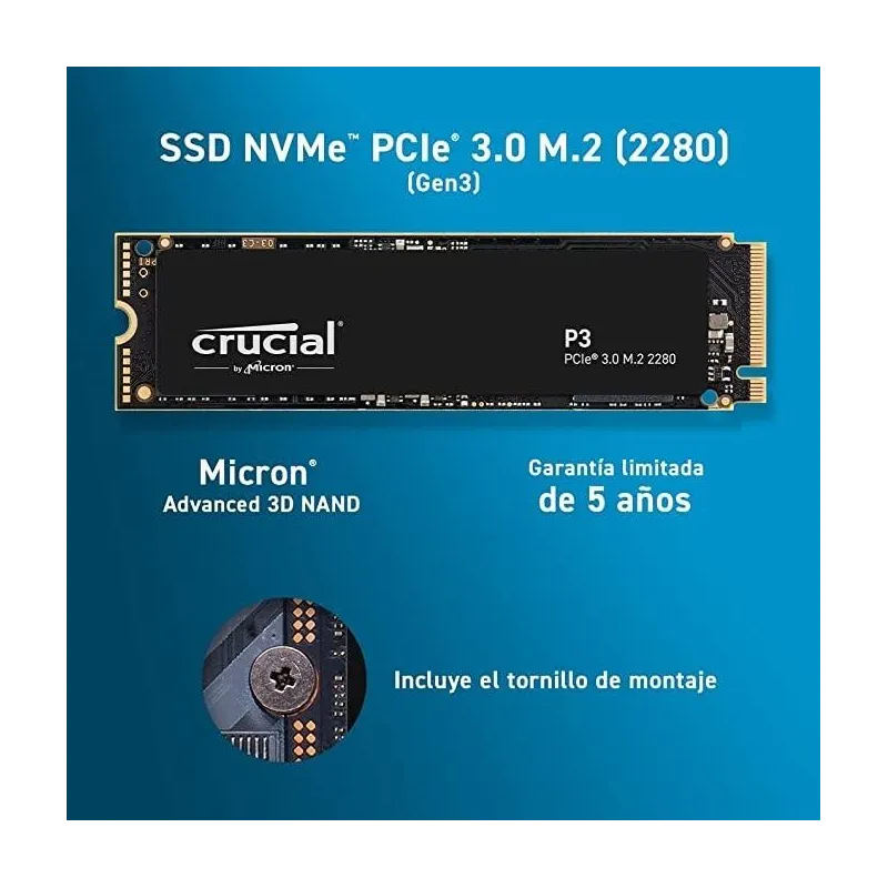 SSD CRUCIAL P3: Una velocidad básica de arranque no es suficiente: ni en el trabajo, ni estando de viaje, ni para videojuegos. Pero la SSD Crucial® P3 lo es todo menos básica. Con un rendimiento NVMe™ casi 6 veces más rápido que SATA y una capacidad de almacenamiento de hasta 4 TB, la P3 deja muy atrás la tecnología de almacenamiento más antigua. Consiga arranques, descargas y transferencias de archivos más rápidos, y almacene todos sus archivos, fotografías, vídeos, aplicaciones y videojuegos, con espacio de sobra con la calidad y fiabilidad que puede esperar de Crucial.