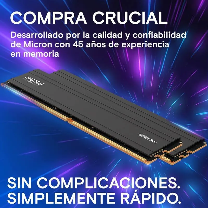 MEMORIA CRUCIAL® DDR5 PRO: Crucial® DDR5 Pro Memory tiene la velocidad vertiginosa y el ancho de banda masivo necesarios para soportar las CPU de múltiples núcleos de próxima generación sin la complicación de hacer overclocking, ajustar la latencia, perseguir chips y LEDs.