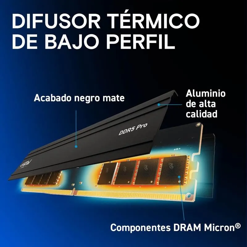 DISIPADOR DE CALOR DE PERFIL BAJO: Disipa el calor del módulo y mejora tu equipo de juego con un aspecto elegante y moderno. Con nuestro disipador de calor de perfil bajo integrado, Crucial DDR5 Pro incluso puede caber en PCs más pequeñas.