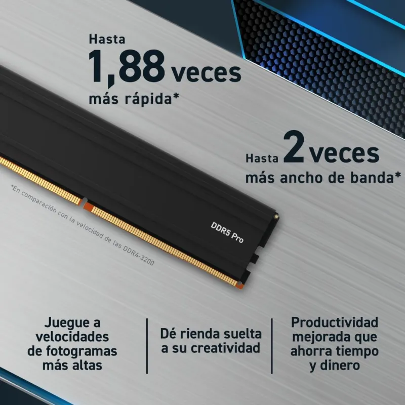 MAYOR PRODUCTIVIDAD PARA CREATIVOS Y PROFESIONALES: Con el doble de ancho de banda que la generación anterior, Crucial DDR5 Pro permite una multitarea de nuevo nivel y un procesamiento más rápido para poder hacer frente incluso a las cargas de trabajo más pesadas en menos tiempo.