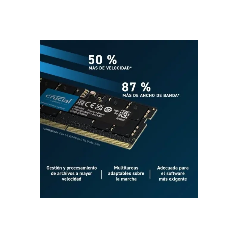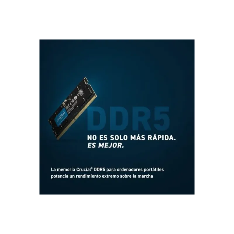 MÁS CAPACIDAD QUE UNA NUBE: Pero la velocidad no lo es todo. También necesitas una memoria que tenga suficiente capacidad para almacenar todos tus archivos, programas y juegos. Por eso, la memoria SO-DIMM DDR5 de Crucial te ofrece 8 GB de capacidad, lo que te permite tener más espacio para guardar todo lo que necesites. Con esta memoria, podrás instalar los juegos más pesados sin preocuparte por el espacio disponible. También podrás trabajar con archivos de gran tamaño sin que se ralentice tu portátil. Y si necesitas más capacidad, puedes ampliarla fácilmente añadiendo más módulos de memoria SO-DIMM DDR5 de Crucial. Con esta memoria, tu portátil tendrá más capacidad que una nube.