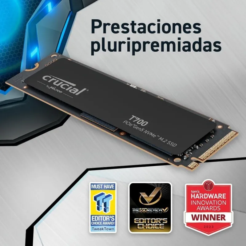 Descubre el nuevo Disco Duro SSD Crucial T700 SSD M.2 2TB , con un rendimiento inigualable de nuestro disco SSD con versión NVMe 2.0 y un factor de forma M.2, diseñado específicamente para PCs. Con una capacidad impresionante de 2 TB, ofrece un almacenamiento masivo que satisface todas tus necesidades. Equipado con la interfaz PCI Express 5.0, garantiza una transferencia de datos ultrarrápida y eficiente.