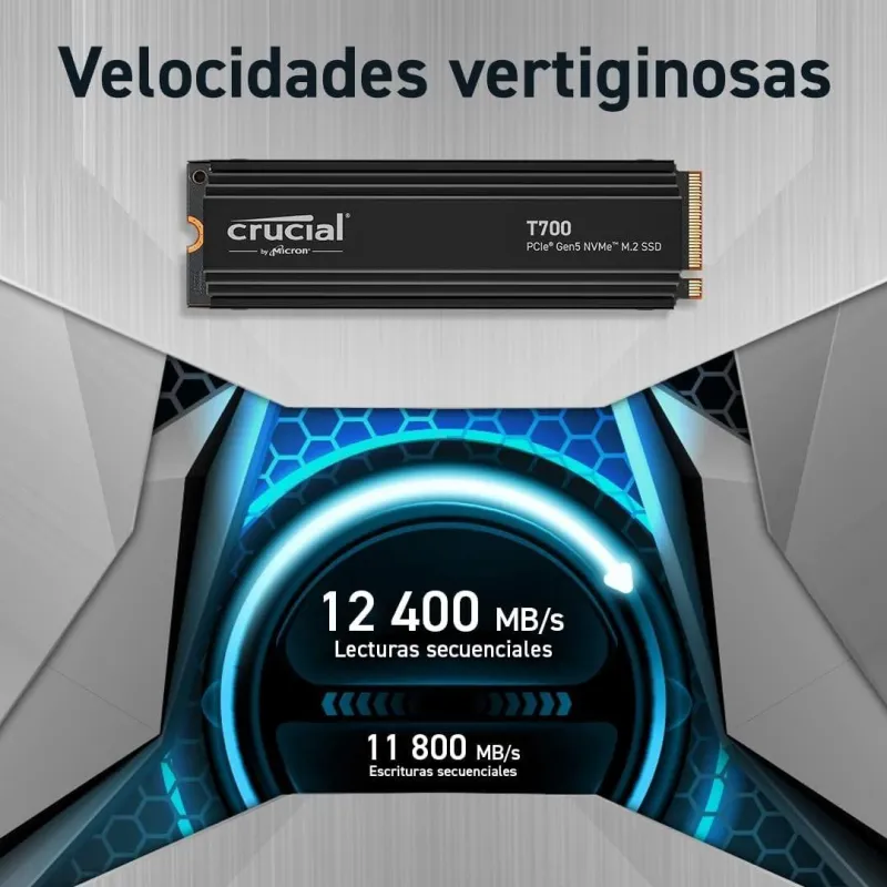 EXPANSIÓN SIN LÍMITES: Con una capacidad masiva de 2 TB, el nuevo Disco Duro SSD Crucial T700 SSD M.2 2TB ,nunca más tendrás que preocuparte por el espacio de almacenamiento. Guarda, accede y gestiona tus datos con facilidad y eficiencia. Este dispositivo de almacenamiento es perfecto para aquellos que manejan grandes archivos, programas exigentes y necesitan un rendimiento consistente y fiable.