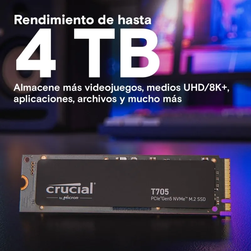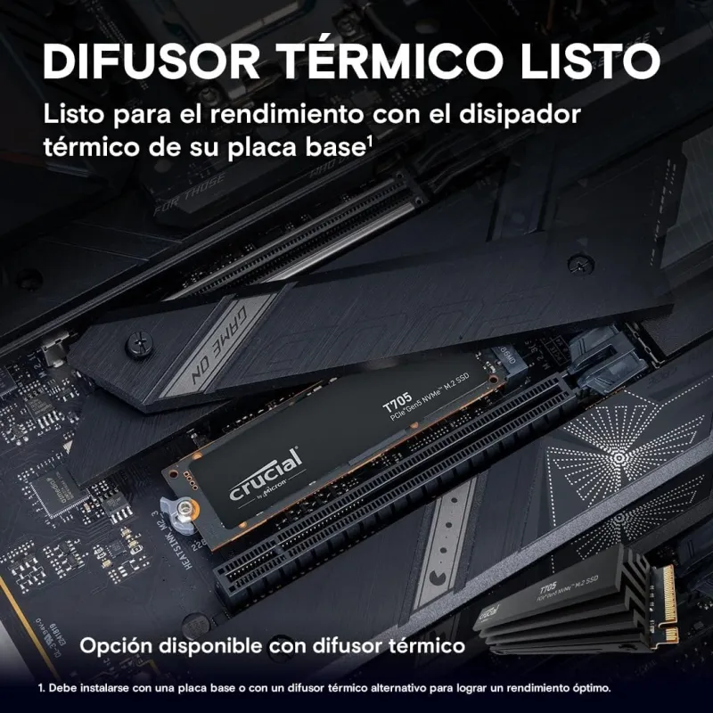 Disco Duro SSD Crucial T705 HS 1TB CT1000T705SSD5 con interfaz PCI Express 5.0, velocidad de lectura 13600 MB/s y capacidad de 1 TB en formato M.2