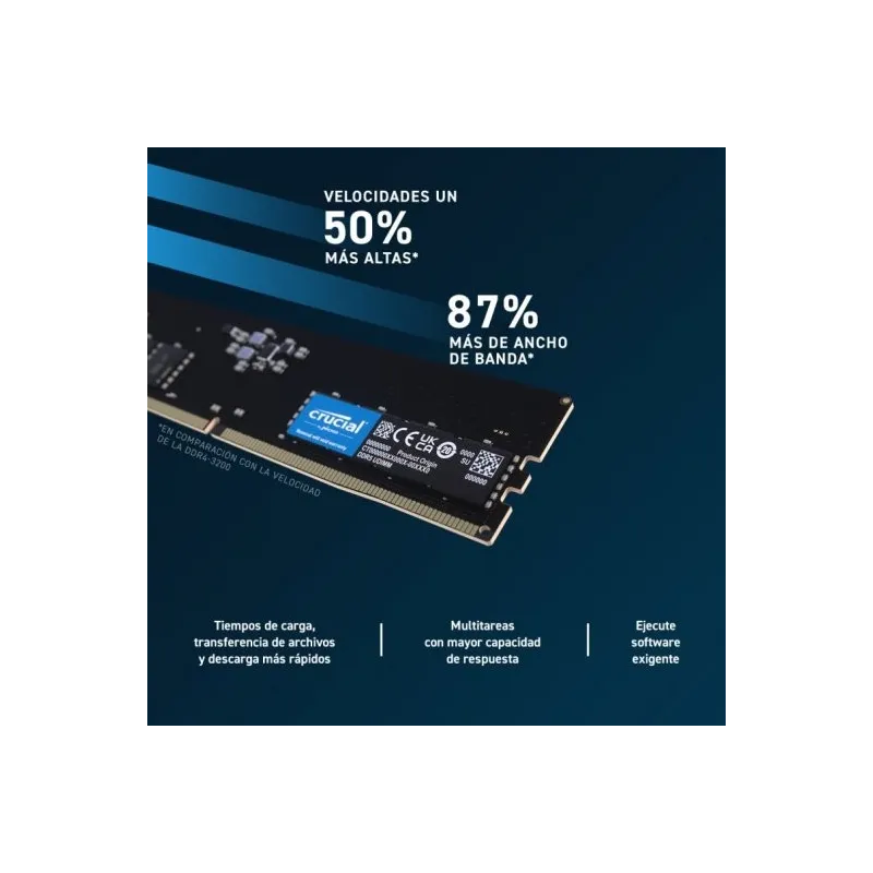 MULTITAREAS CON MAYOR CAPACIDAD DE RESPUESTA: Las memorias Crucial DDR5 ofrecen velocidades un 50 % más altas que las DDR4 en su lanzamiento, lo que permite a los usuarios un rendimiento extremo desde el primer momento. Y algo todavía más impresionante: las Crucial DDR5 están optimizadas para mejorar el rendimiento y las multitareas, no solo durante las pruebas sino también en condiciones reales. Ahora, abrir más pestañas de navegador y cambiar entre aplicaciones es más rápido que nunca.