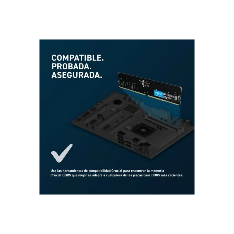 CALIDAD MICRON®: FIABILIDAD PROBADA PARA SU SEGURIDAD: Como marca de consumo integrada verticalmente de Micron, millones de usuarios confían en Crucial por su fiabilidad, rendimiento y compatibilidad. Al contrario de lo que ocurre con los ensambladores de módulos, nuestra relación única con Micron nos ha llevado a colaborar en el campo de la ingeniería a un nivel mucho más profundo para sacar el máximo rendimiento a nuestros productos sin comprometer su fiabilidad. Con los más de 43 años de excelencia en fabricación que ostenta Micron y los más de 25 años de desarrollo de productos para el mercado de consumo de Crucial, las Crucial DDR5 ofrecen además una garantía limitada de por vida9 y un potente rendimiento en el que puede confiar. Cuando se trata de memorias, no se conforme con menos.