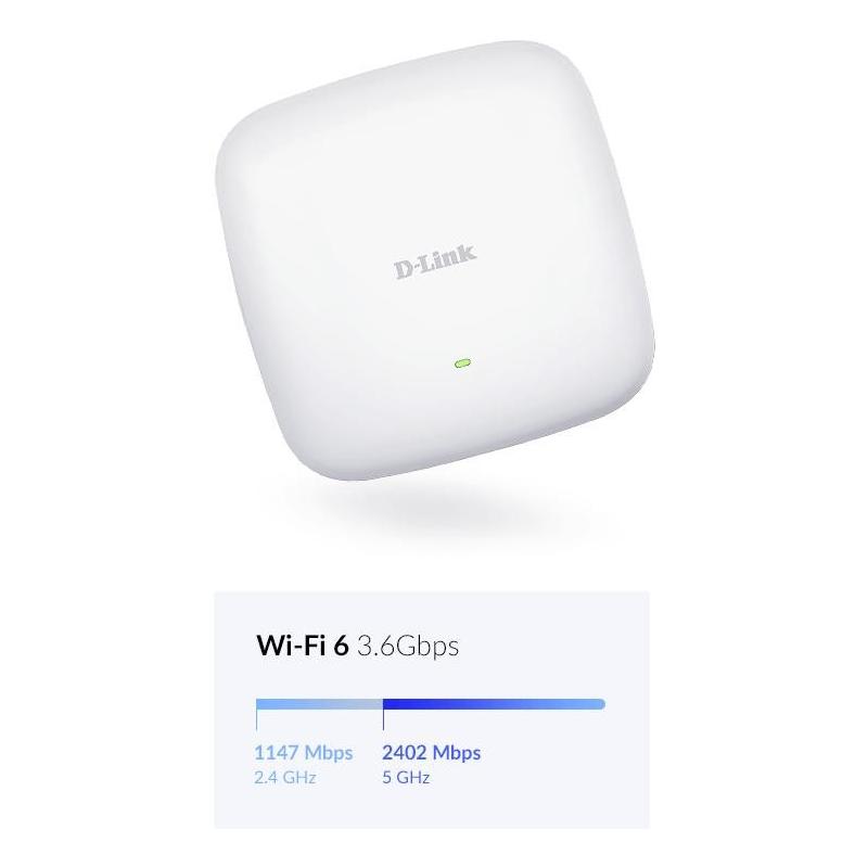 RENDIMIENTO WI-FI 6 DE ÚLTIMA GENERACIÓN QUE POTENCIA SU NEGOCIO: Con velocidades combinadas Wi-Fi 6 (802.11ax) de hasta 3600 Mbps, DAP-X2850 permite grandes transferencias de datos y transmisiones de vídeo de calidad superior, incluso en entornos altamente congestionados. Wi-Fi 6 ofrece una mayor eficiencia de la red y menor latencia, con casi cuatro veces más capacidad que los estándares Wi-Fi anteriores.