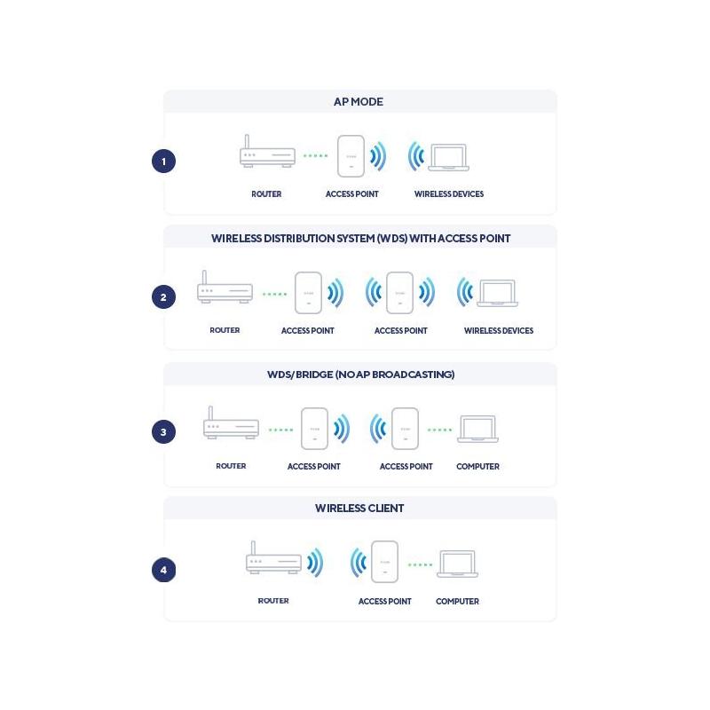 - Admite múltiples modos de punto de acceso para optimizar el rendimiento en función de las necesidades de su red