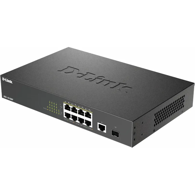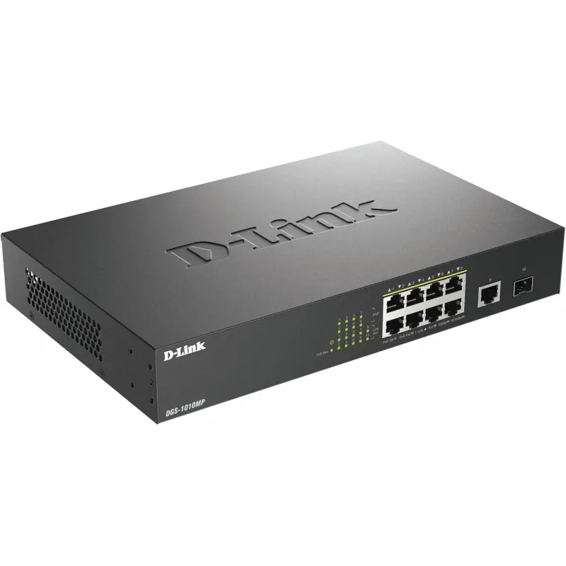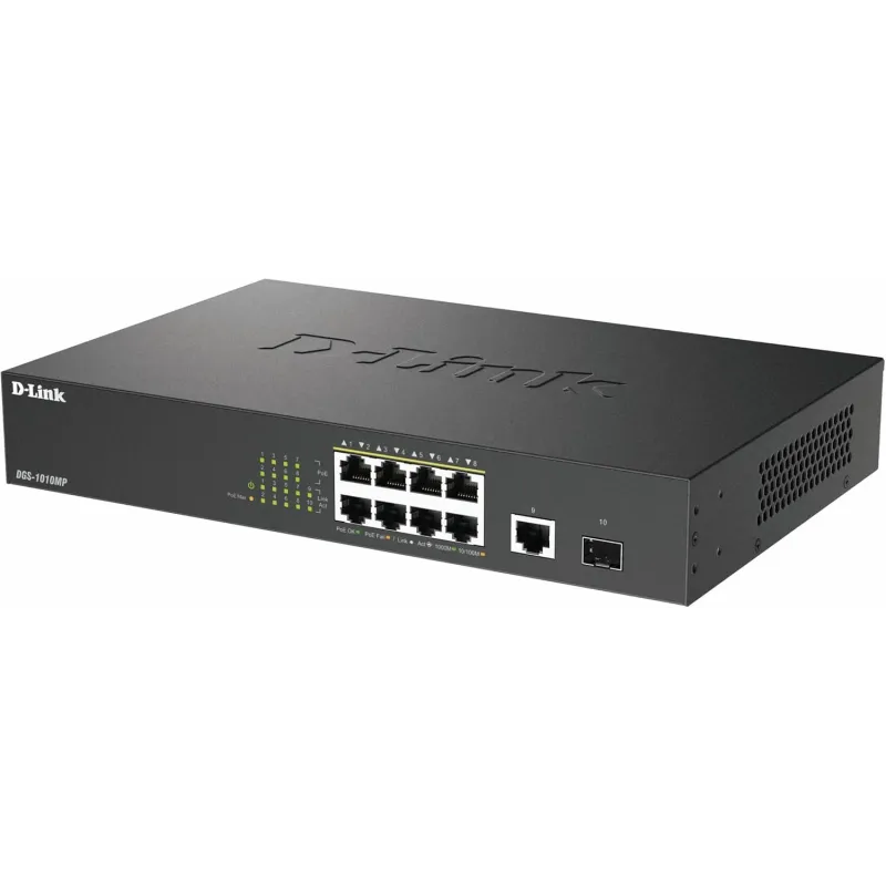 Switch D-Link DGS-1010MP 8xG PoE no gestionado con 8 puertos Gigabit PoE+, 1 uplink Gigabit y 1 SFP, ideal para pequeñas redes IP.