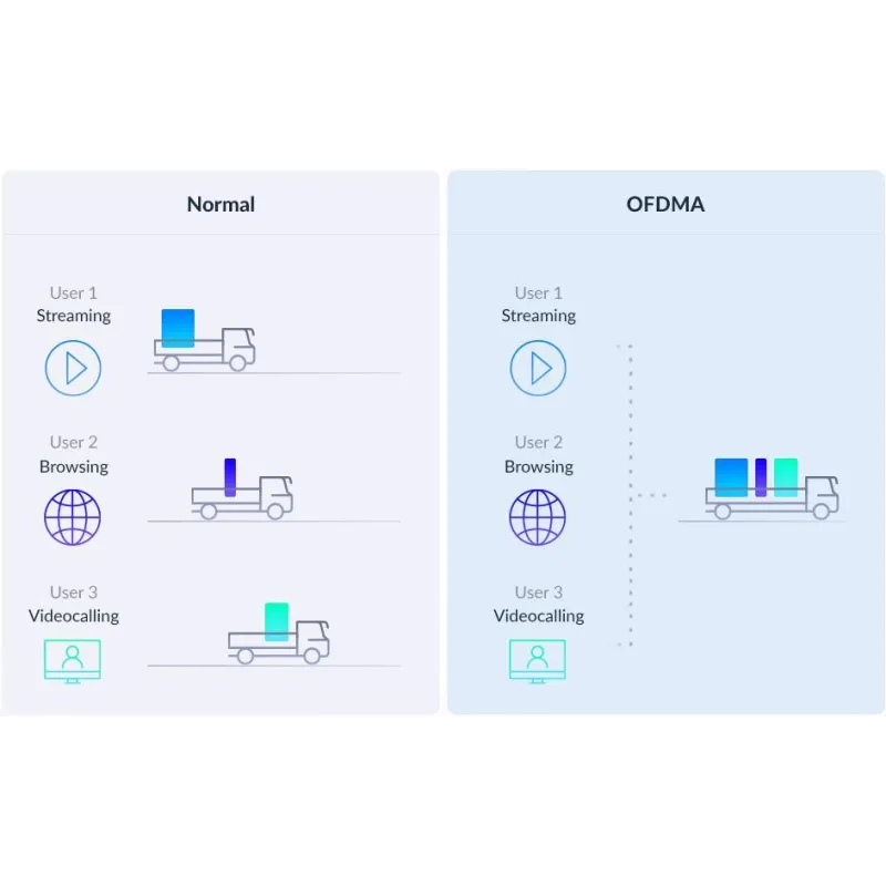 OFDMA: Los paquetes de datos destinados a varios dispositivos se transmiten juntos y nunca se tienen que poner en cola de nuevo. Es perfecto cuando variosdispositivos necesitan un gran ancho de banda para que no se estorben entre ellos