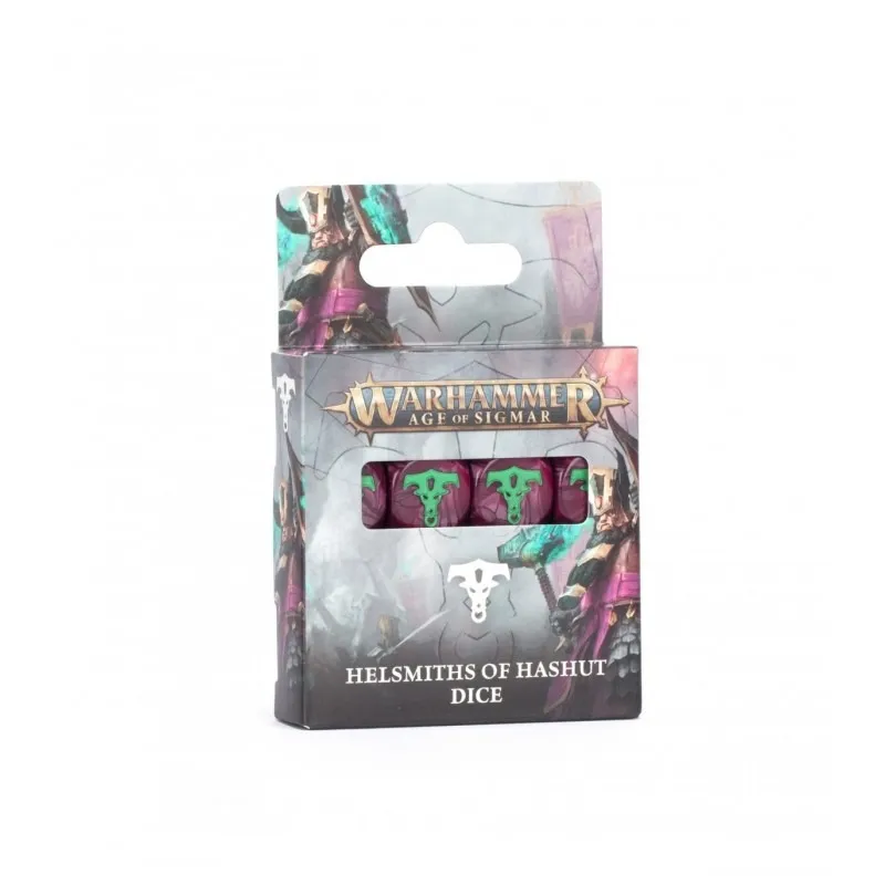 Set oficial de 16 dados de seis caras para Warhammer Age of Sigmar inspirado en los Helsmiths of Hashut. Cada dado mide 16 mm, está fabricado en acrílico morado con veteado marmoleado y números marcados en tinta verde para buena legibilidad. Las caras del 1 al 5 usan puntos tradicionales, mientras que el 6 luce el icono taurino del Bullfather.