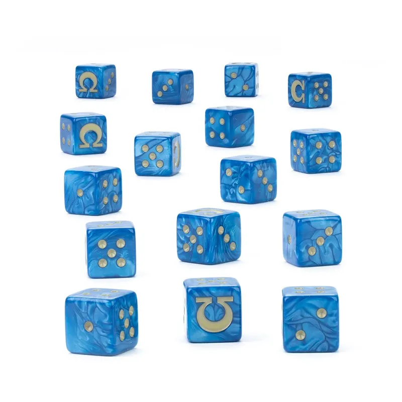 Son 16 dados de seis caras fabricados en plástico azul perlado con muescas doradas y el símbolo de los Ultramarines en la cara del seis, perfectos para defender Ultramar junto a Marneus, Cato y sus muchachos.