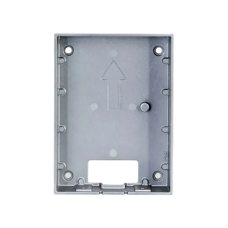 La Dahua VTM115 es una caja de montaje en superficie pensada para instalar un Dahua VTO2202F-P sobre pared, sin empotrar. Es una pieza mecánica: su trabajo es dar soporte, ordenar el paso del cable y dejar un remate más sólido que colgar el frontal directamente.