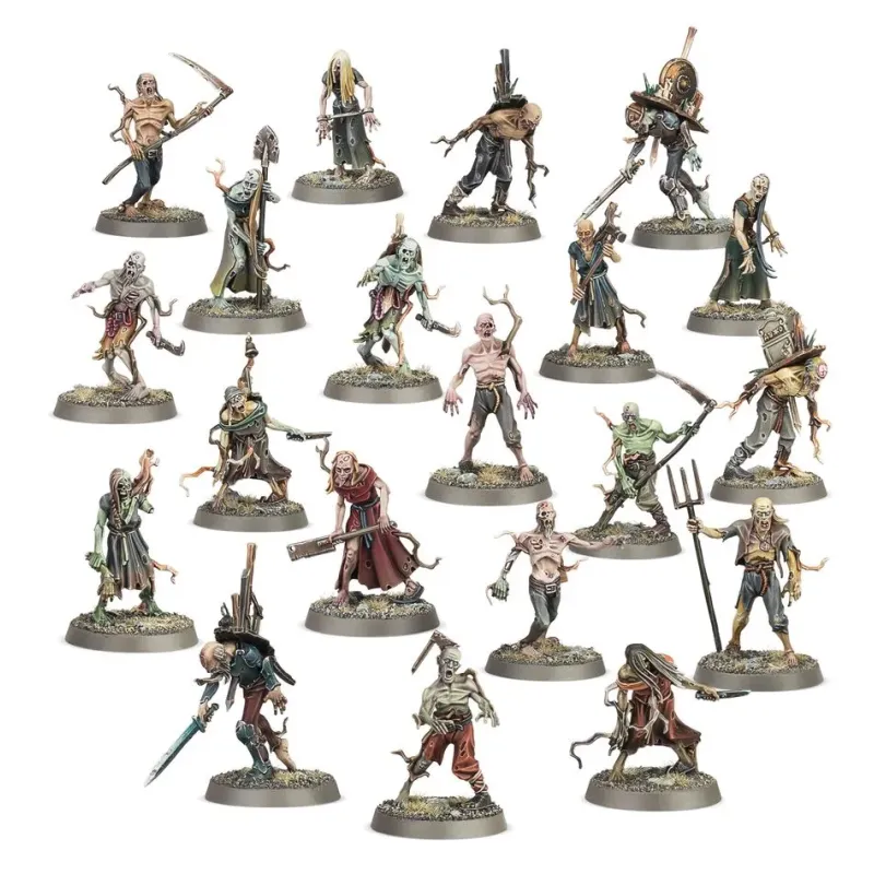 Incluye 20 miniaturas multicomponente de plástico, con una matriz cargada de cabezas, brazos y detalles alternativos, para que cada zombi tenga personalidad propia y puedas montar campeones, portaestandartes y músicos según tu lista.