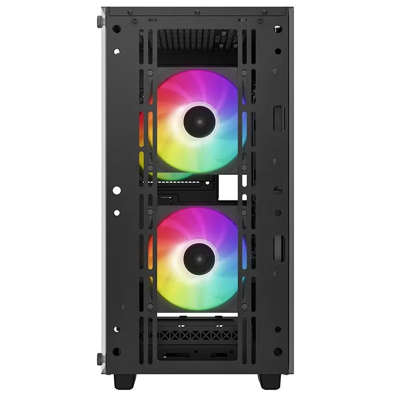 Este gabinete cuenta con 2 puertos 3.5" y 3 bahías 2.5', además de 4 ranuras de expansión, lo que permite una buena flexibilidad en la elección de componentes. La ventana lateral y la iluminación RGB multicolor en los ventiladores de la caja añaden un toque estético, permitiendo a los usuarios mostrar su configuración con estilo.