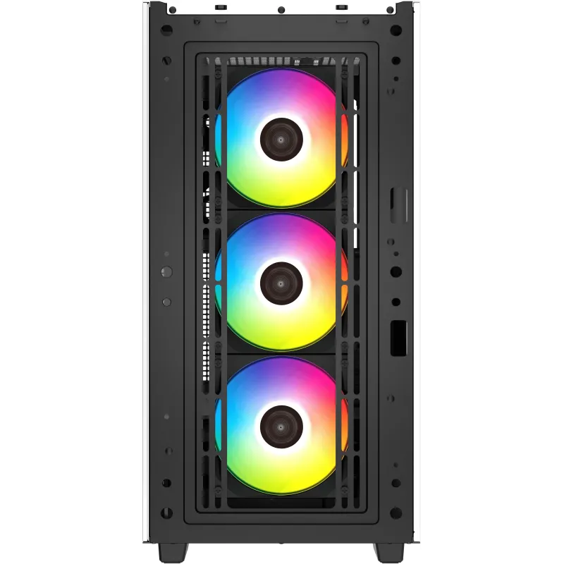 E/S FRONTAL MODERNA: Cuenta con dos puertos USB 3.0, un único puerto USB 3.1 tipo C y un conector de audio combinado para las conexiones más importantes de cerca. Un botón de control RGB dedicado ofrece múltiples efectos de iluminación preestablecidos para los ventiladores ARGB incluidos.