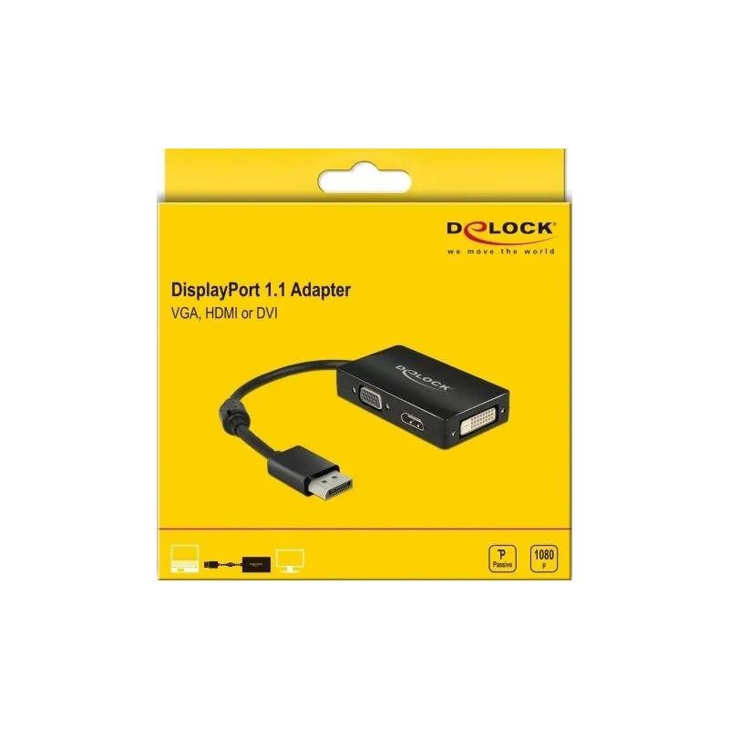 DESCRIPCIÓN: Con este adaptador DisplayPort de Delock, el sistema se puede ampliar con una interfaz VGA, HDMI o DVI y se pueden instalar varios dispositivos, como un televisor, un proyector, un monitor, etc. Solamente se puede utilizar un monitor en el adaptador.