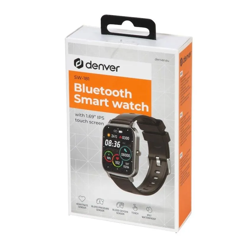 Smartwatch Denver SW-181 con sensor de frecuencia cardíaca, monitor de presión arterial y oxígeno en sangre. Este Reloj inteligente dispone de Bluetooth, rastrea tus pasos y sueño, muestra el identificador de llamadas y notificaciones por SMS, y múltiples opciones más, además tiene carga USB magnética.