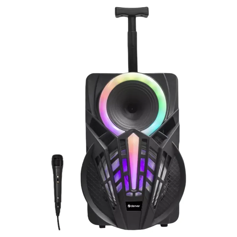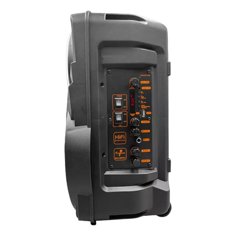 - 8", Bluetooth, altavoz con ruedas, USB, MIcroSD, AUX, entrada de micrófono, salida de potencia máxima de 120 W