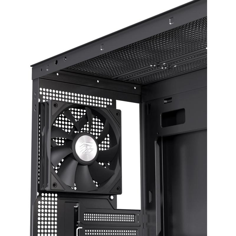 La caja permite una excelente ventilación con soporte para hasta 2 ventiladores laterales de 120 mm, 1 ventilador trasero de 120 mm, y hasta 3 ventiladores superiores de 120/140 mm, además de soportar refrigeración líquida con espacio para radiadores de hasta 360 mm en la parte superior y 120 mm en la parte trasera. Esto garantiza un enfriamiento eficiente, incluso en las configuraciones más exigentes.
