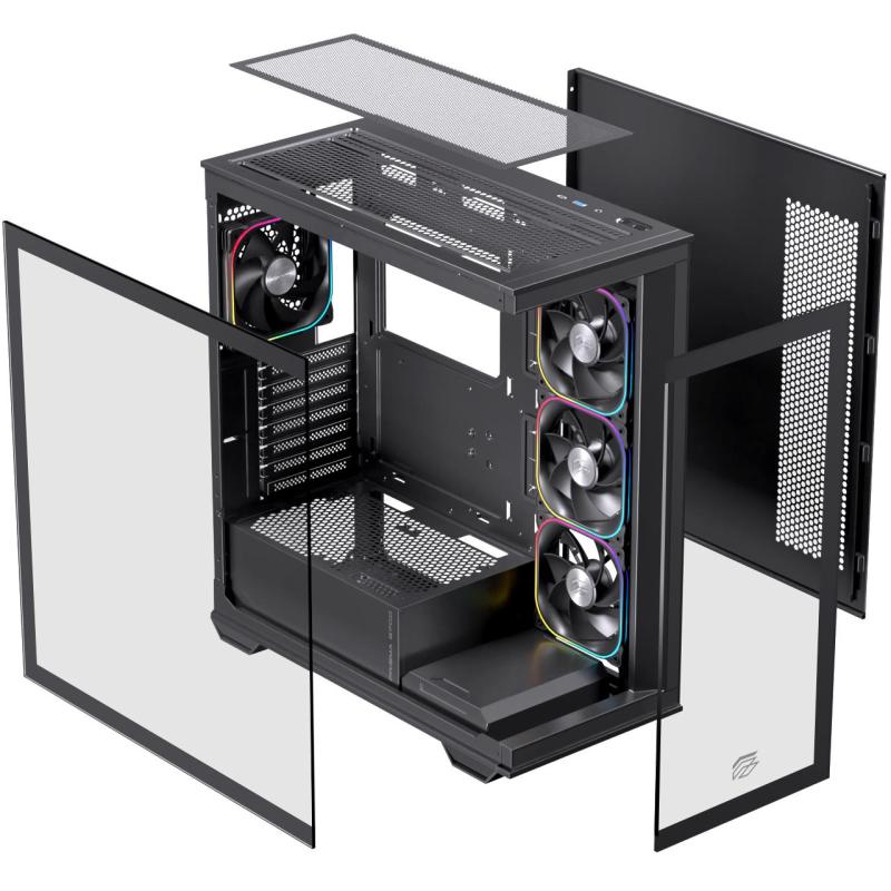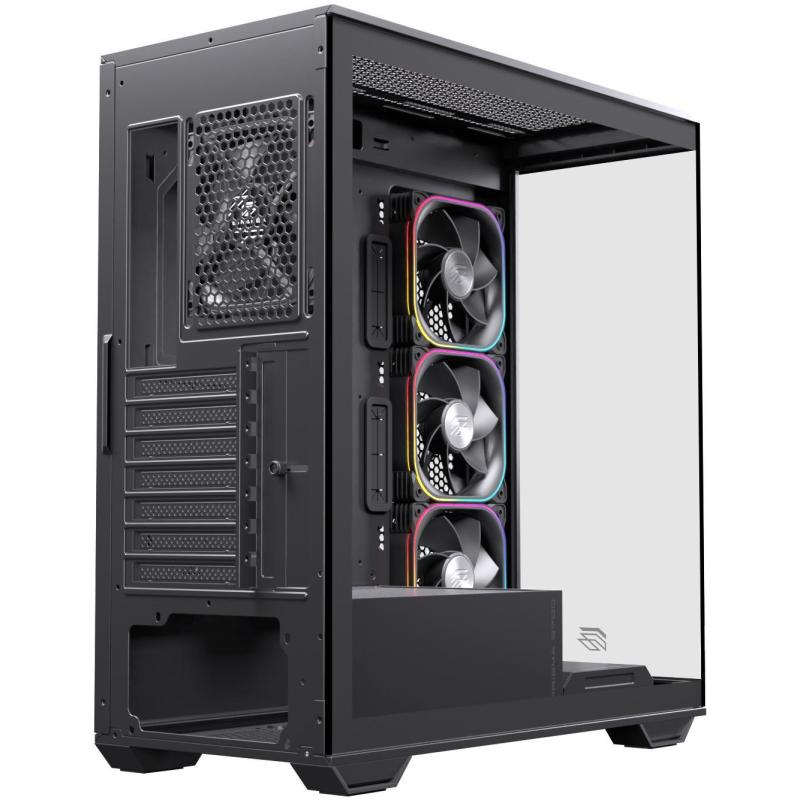 La caja de ordenador gaming con iluminación RGB está equipada con ventiladores RGB preinstalados que garantizan una refrigeración eficiente y un estilo vibrante. Dispone de soporte para refrigeración líquida, con espacio para radiadores de hasta 360 mm en la parte superior, asegurando temperaturas óptimas incluso en sesiones de juego intensas. Su sistema de gestión de cables facilita una instalación limpia y ordenada, mejorando el flujo de aire dentro del gabinete.