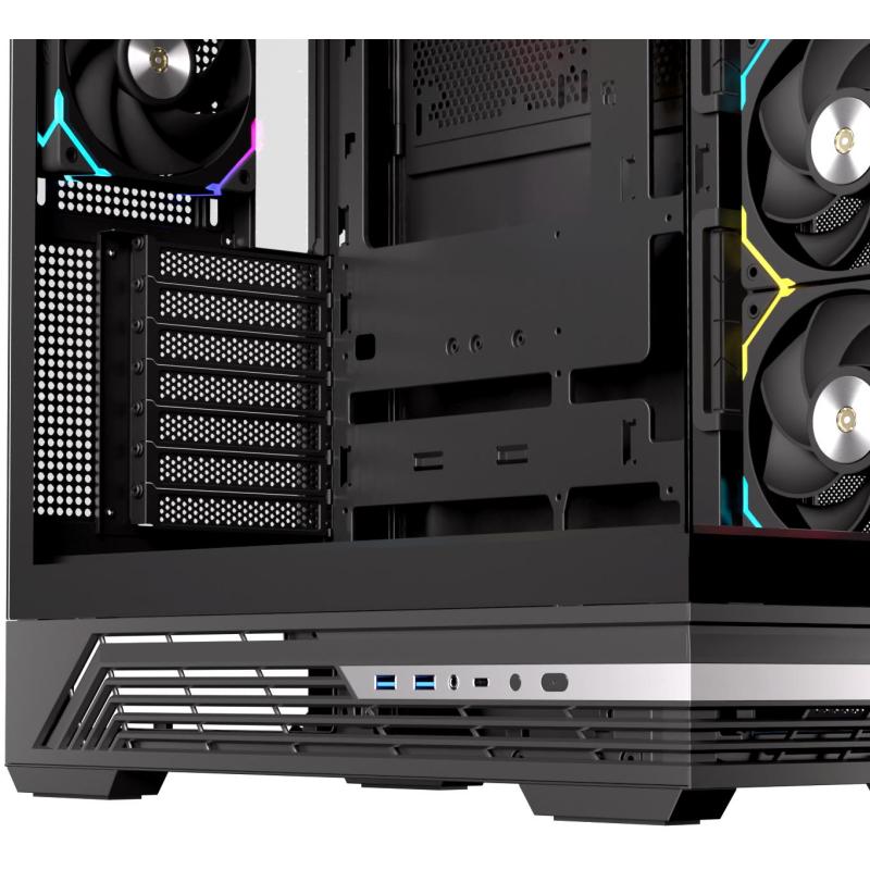 AMPLIA COMPATIBILIDAD Y ESPACIO INTERNO: Diseñada para alojar tarjetas gráficas de hasta 43.5 cm, esta caja de PC con vidrio templado permite configuraciones avanzadas sin restricciones. Su interior optimizado incluye bahías para discos de 2.5'' y 3.5'', facilitando la instalación de unidades de almacenamiento. Además, el sistema de gestión de cables garantiza una instalación ordenada y sin obstrucciones.
