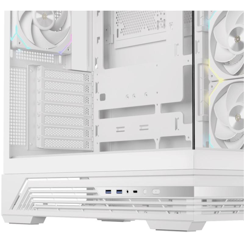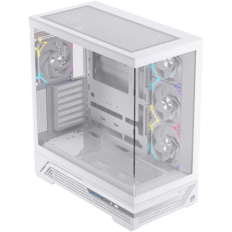 Torre Einarex Prisma S800 Core RGB White en términos de conectividad, la caja ofrece dos puertos USB 3.2 Gen 1 Tipo A, un puerto USB 3.2 Gen 2 Tipo C y una salida de audio, asegurando compatibilidad con los dispositivos más actuales. Su diseño incluye una ventana lateral para exhibir los componentes internos y una construcción optimizada para el montaje de tarjetas gráficas de hasta 43.5 cm. Con un peso de 7.7 kg y dimensiones de 233 mm de ancho, 444 mm de profundidad y 493 mm de altura, es una opción ideal para quienes buscan una torre gaming con iluminación RGB sin comprometer el rendimiento térmico ni la estética.