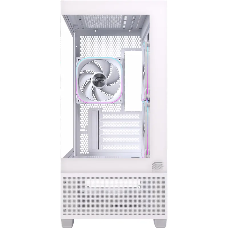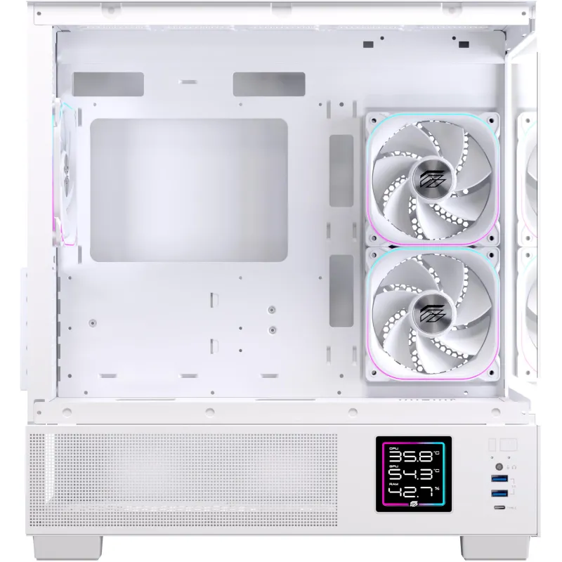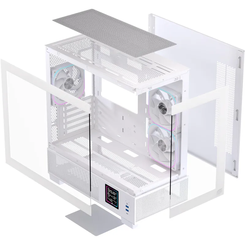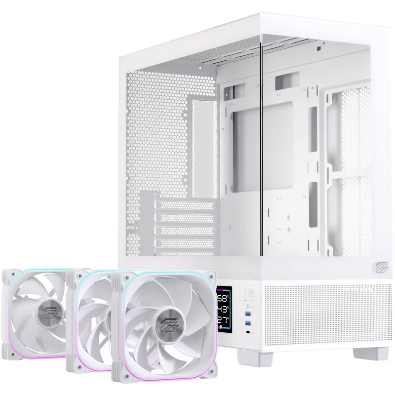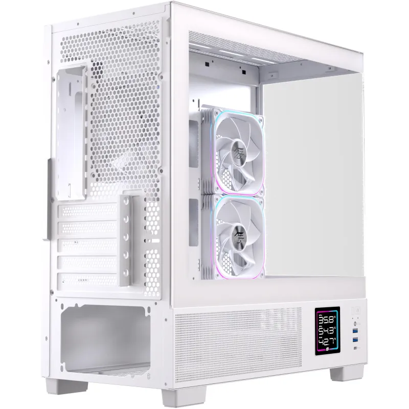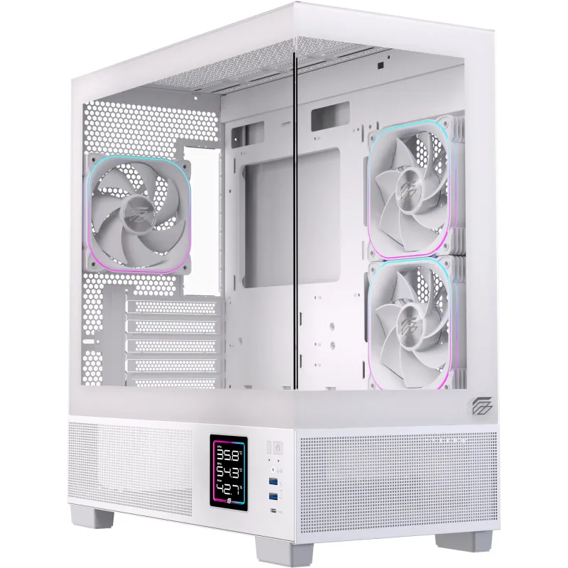 Por qué elegirla: micro torre blanca mATX/ITX con vidrio panorámico, USB-C frontal, soporte para GPU larga, opción de AIO 360 mm y almacenamiento mixto (SSD + HDD).