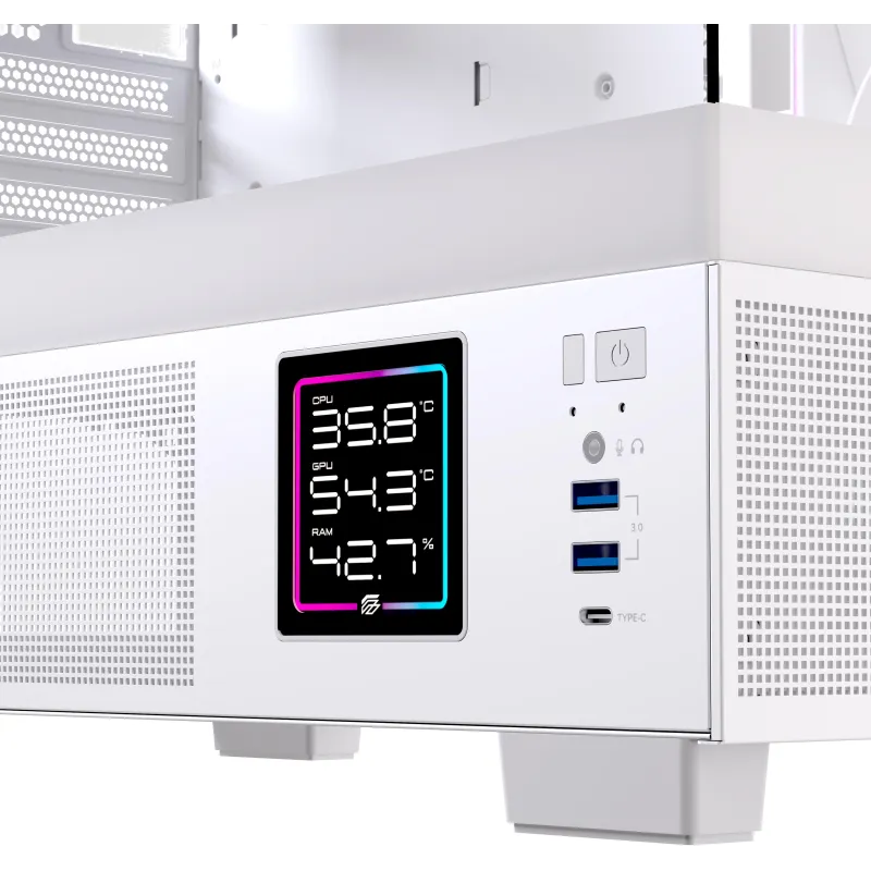 Y el toque diferencial: la pantalla lateral para ver estado del sistema (CPU/GPU/almacenamiento) sin abrir software ni overlays. Si te gusta tener el PC “bajo control” o ajustar ventilación por temperaturas, es un extra muy agradecido.