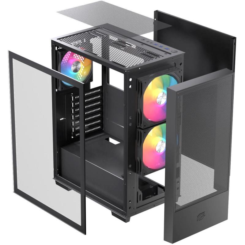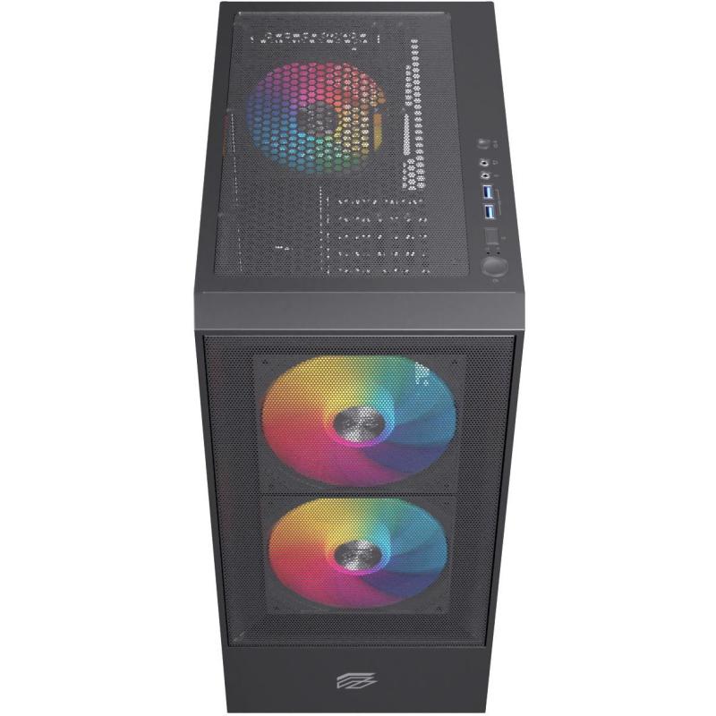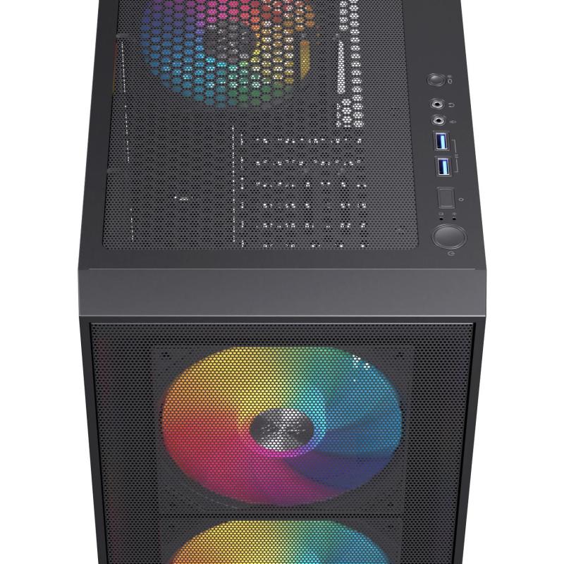 La caja cuenta con un diseño espacioso que admite tarjetas gráficas de hasta 33 cm de longitud y disipadores de CPU de hasta 17,5 cm de altura, permitiendo la instalación de hardware de alto rendimiento. Además, dispone de dos bahías de 3.5" y dos de 2.5", ofreciendo una gran capacidad de almacenamiento para discos HDD y SSD. Su panel frontal incluye dos puertos USB 3.2 Gen 1, entrada y salida de audio, así como botones de encendido, reinicio y control de iluminación RGB, brindando accesibilidad y comodidad en su uso diario.
