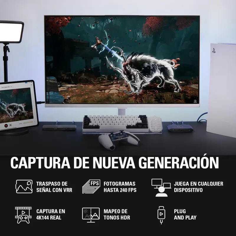 Si quieres capturar señal HDMI en 4K ULTRA HD y mantener una experiencia fluida, este modelo se apoya en una tasa de refresco de 144 Hz y conexión por USB.