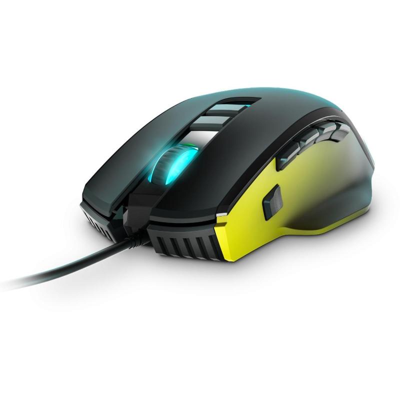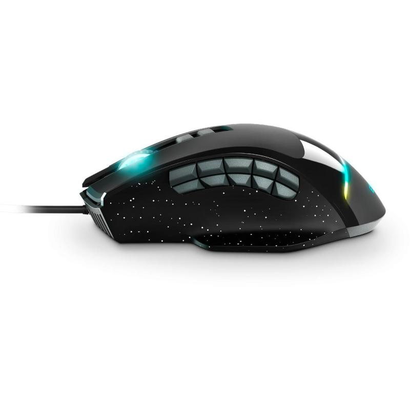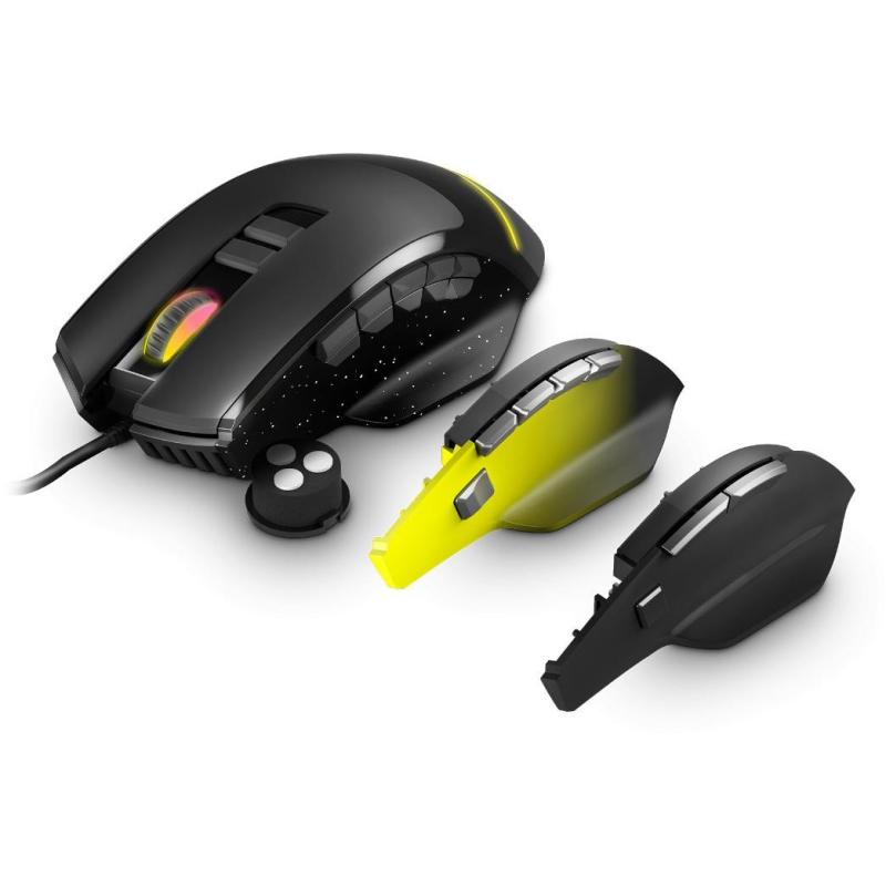 Ratón con cable para jugadores exigentes con luces RGB, peso regulable en la base, 3 botoneras intercambiables laterales y con hasta 15 botones configurables.