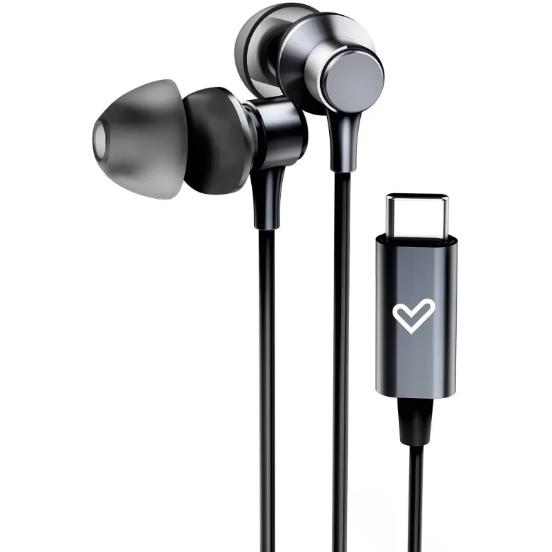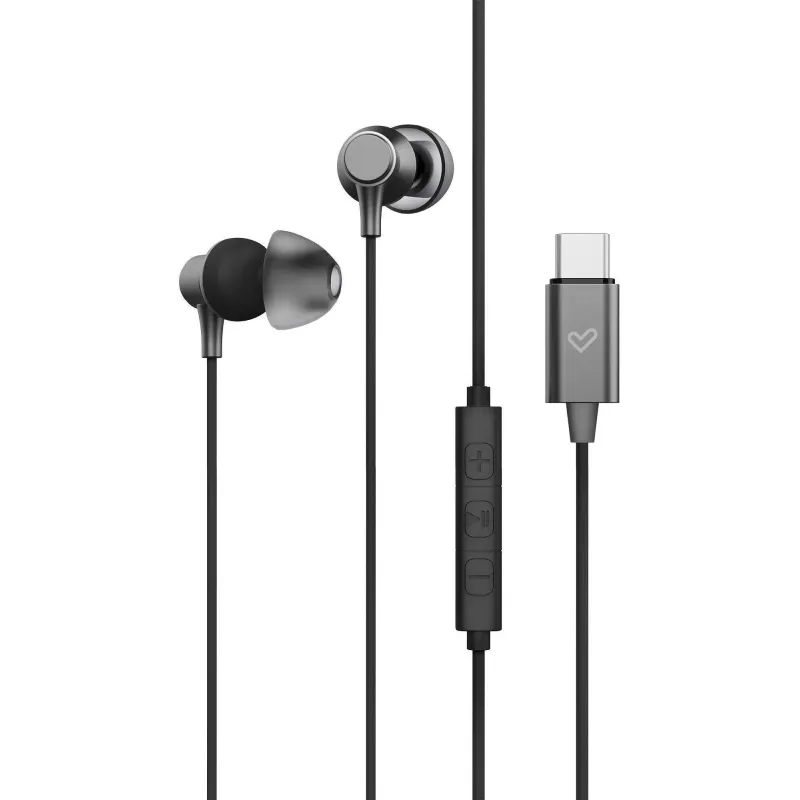 Auriculares intrauditivos con conexión tipo C y conversor digital integrado para un sonido HD. Fabricados en aluminio con plástico reciclado. Cuenta con funda de transporte, micrófono y controlador de 3 botones para ajustar el volumen y cambiar de canción.