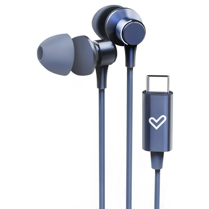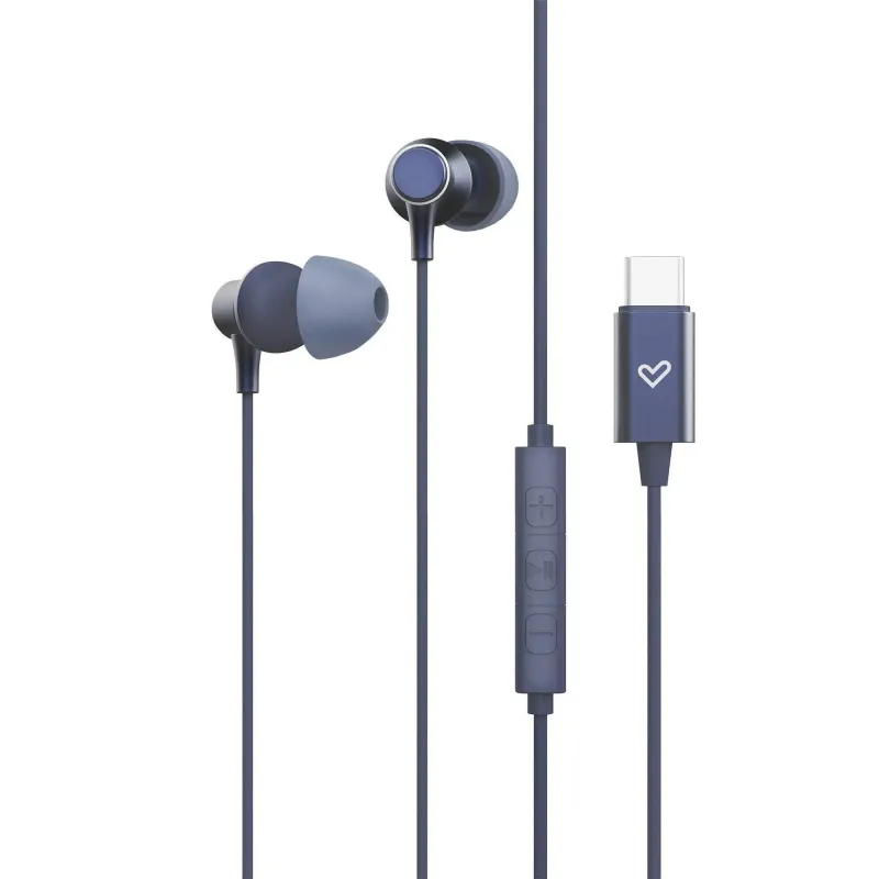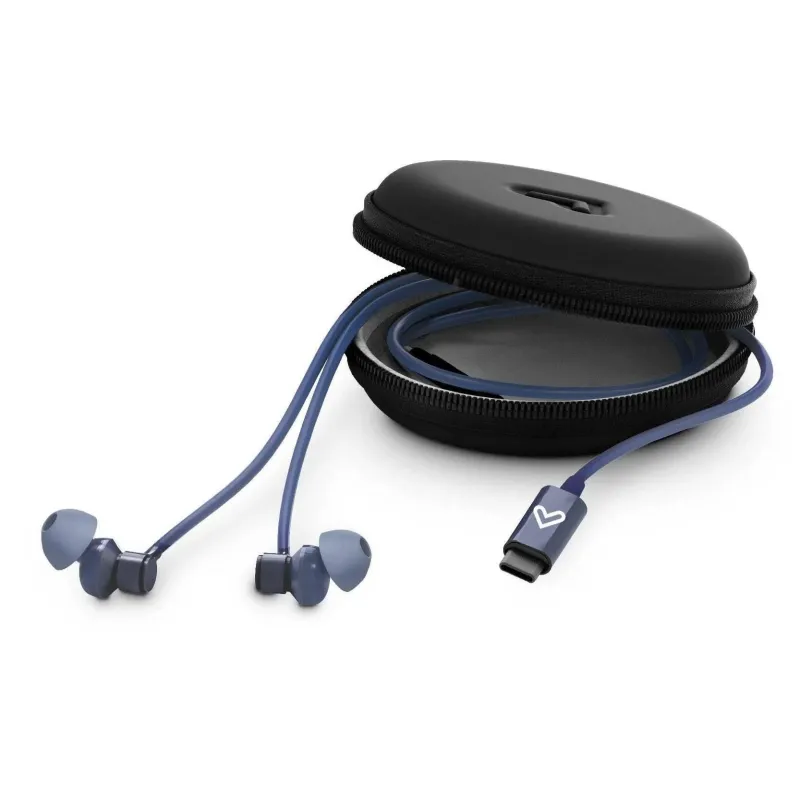 Auriculares intrauditivos con conexión tipo C y conversor digital integrado para un sonido HD. Fabricados en aluminio con plástico reciclado. Cuenta con funda de transporte, micrófono y controlador de 3 botones para ajustar el volumen y cambiar de canción.