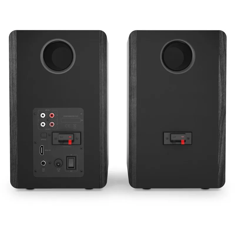 Juego de dos altavoces activos de estantería 2.0, DSP con varios modos de ecualización, entrada doble RCA Bluetooth 5.0, entrada óptica TOSLINK, entrada HDMI CEC, ajuste de graves, agudos y volumen en la parte lateral, carcasa de MDF y mando a distancia.