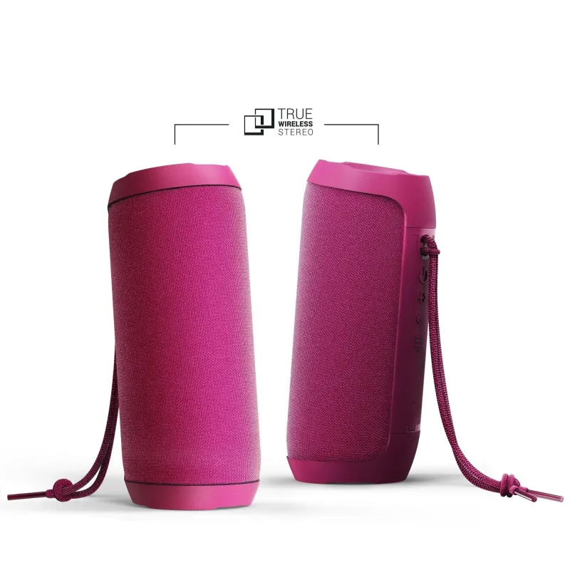 Altavoz estéreo con tecnología Bluetooth 5.0 y True Wireless Stereo para utilizar dos unidades simultáneamente. Doble membrana de realce de bajos, reproductor MP3 por USB / microSD, radio FM y audio-in.