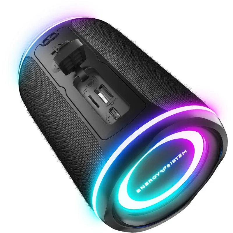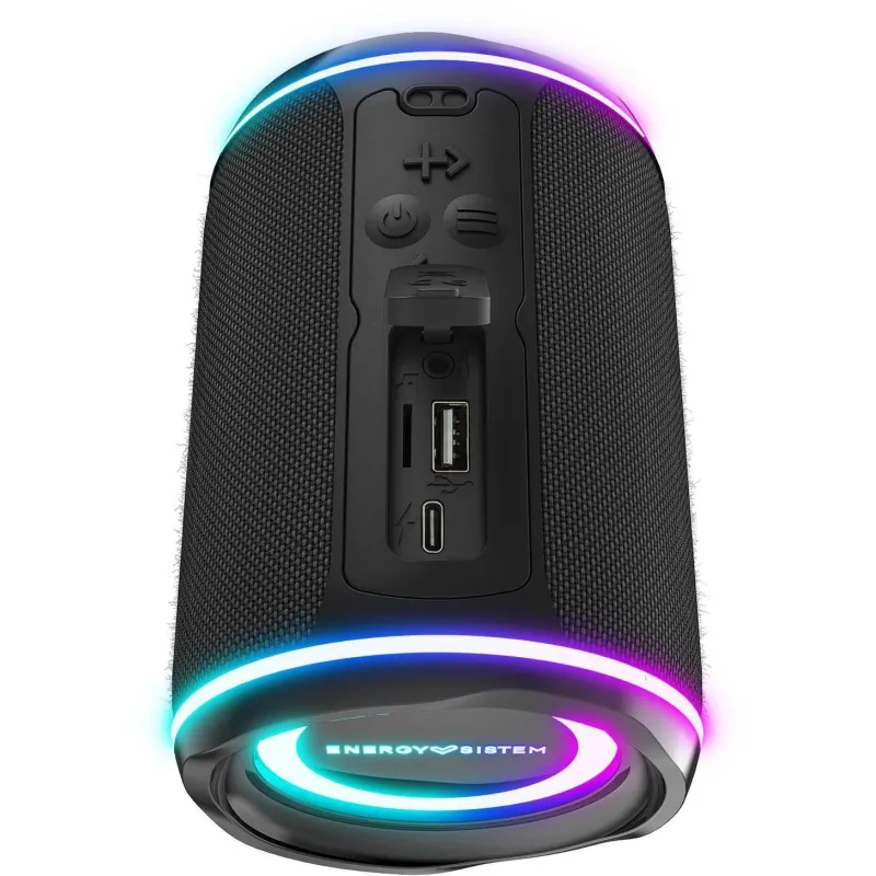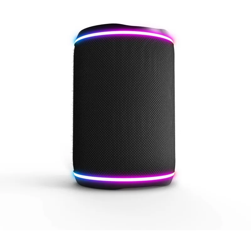 Altavoz estéreo de 16 W con diferentes secuencias de luces RGB, tecnología Bluetooth 5.1 y True Wireless Stereo para utilizar dos unidades simultáneamente. Doble membrana de realce de bajos, reproductor MP3 por USB / microSD y audio-in.