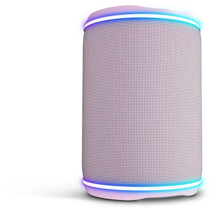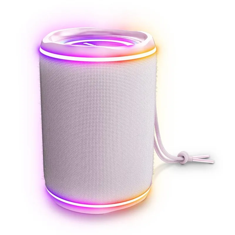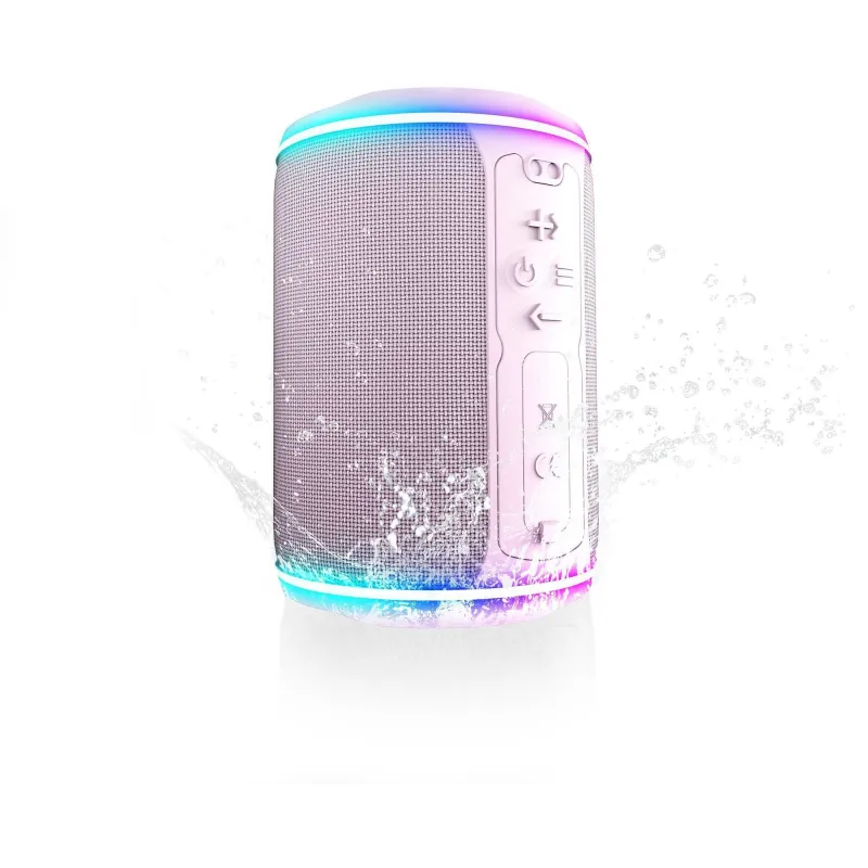 Altavoz estéreo de 16 W con diferentes secuencias de luces RGB, tecnología Bluetooth 5.1 y True Wireless Stereo para utilizar dos unidades simultáneamente. Doble membrana de realce de bajos, reproductor MP3 por USB / microSD y audio-in.