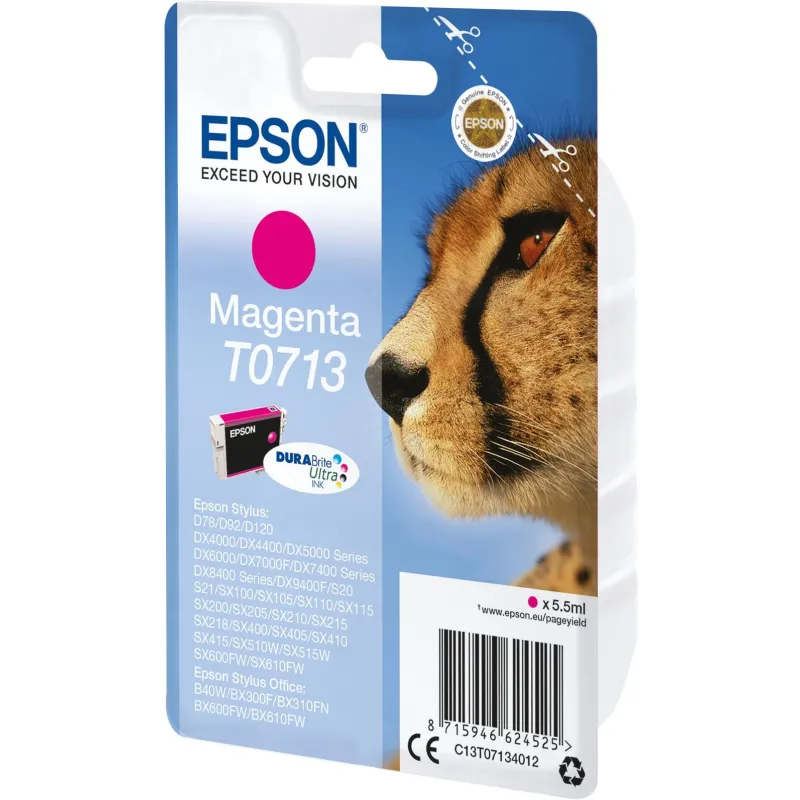 Cartucho de Tinta Epson T0713 Magenta original Epson, con tinta a base de pigmentos, ofrece una experiencia de impresión superior gracias a su tecnología de inyección. Compatible con una amplia gama de impresoras Epson Stylus y Epson Stylus Office, como la SX160FW, SX600FW, BX610FW, y BX300F, este cartucho asegura una alta versatilidad y rendimiento.