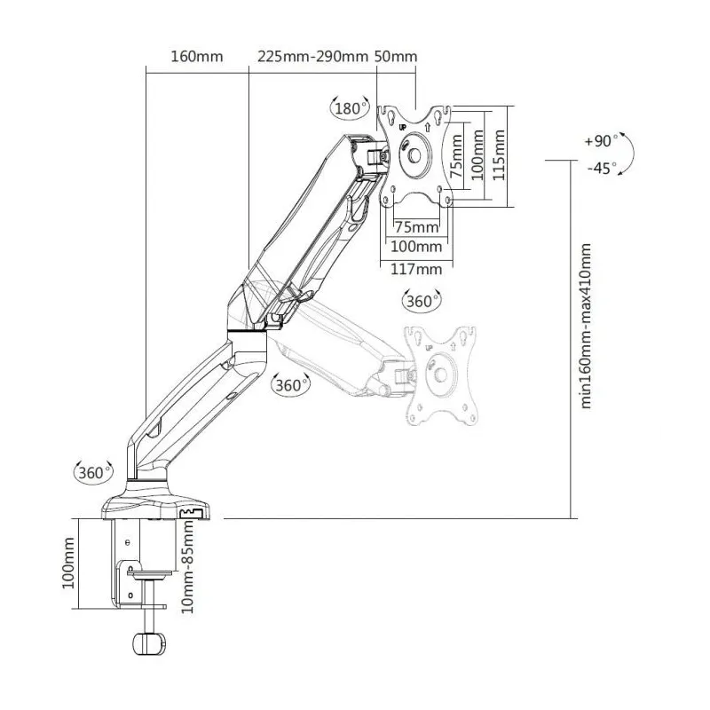 13" - 27" - Compatible con VESA: 75x75, 100x100 - Peso máximo soportado de pantalla: 9 kg - Ángulo de inclinación: -45 - 90° - Ángulo de giro: -90 - 90°
