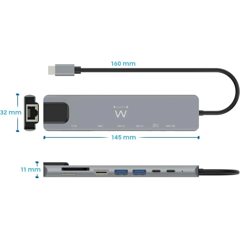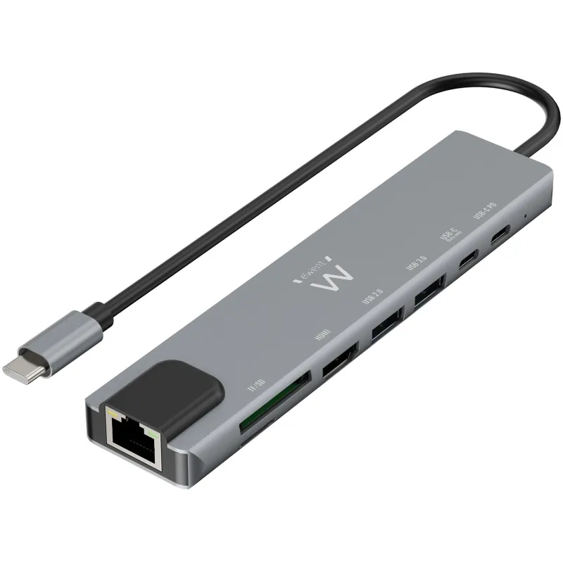 Ewent EW1146 Docking Station 8 puertos USB-C a USB-C/USB-A/HDMI/RJ-45/MicroSD/SD 15 cm Gris