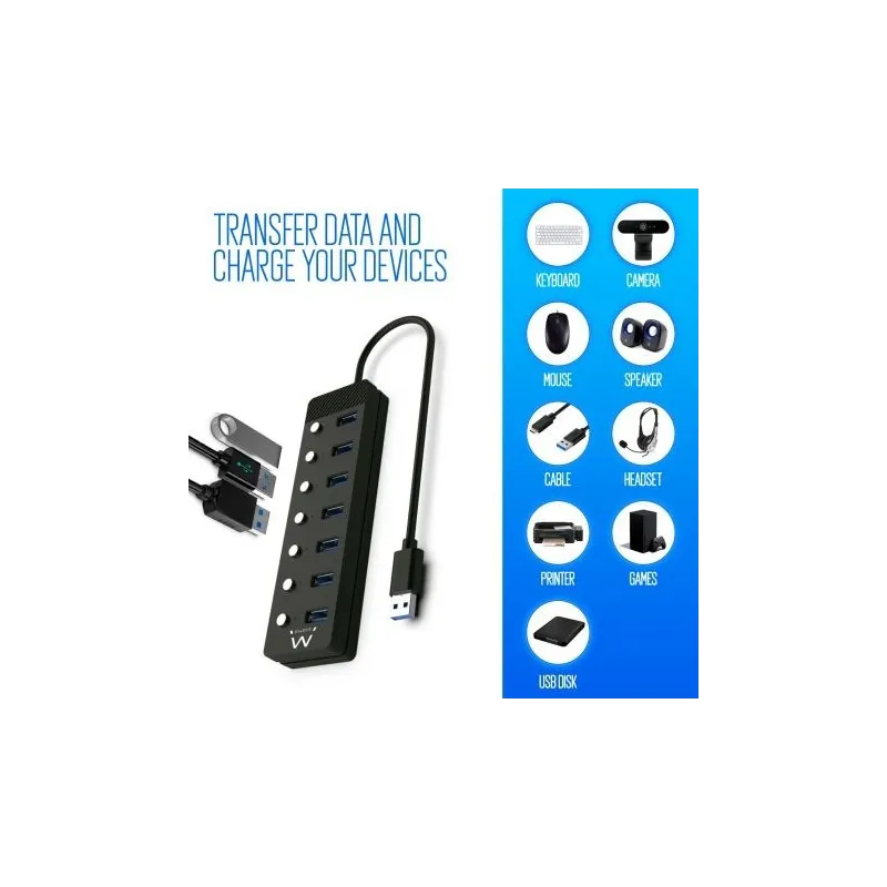 TRANSFERENCIAS DE DATOS SÚPER RÁPIDAS: Nuestro HUB 7 puertos EW1147 permite transferencias de datos súper rápidas de hasta 5 Gbps, de esta manera puede transferir películas HD o archivos masivos en unos pocos segundos. En este HUB puede conectar sin ningún tipo de problemas dispositivos anteriores a USB 3.0 ya que es totalmente retrocompatible con los estándares USB 2.0, 1.1 y 1.0.