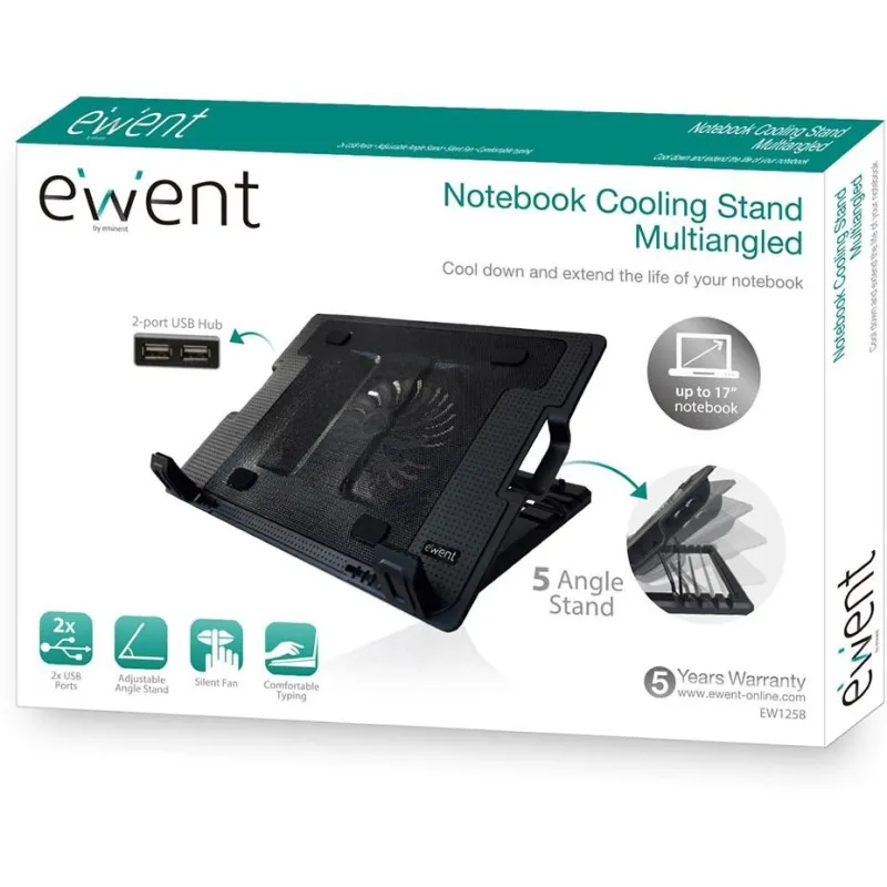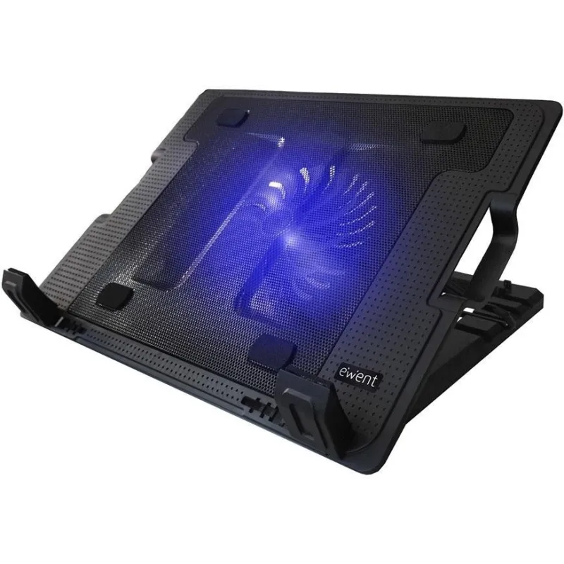 El Estante de Enfriamiento Plegable para Portátil de multi ángulo Ewent EW1258 cuenta con una superficie de malla de metal con un potente ventilador 12,5cm silencioso para evitar que los dispositivos se sobrecalienten. Este soporte versátil se puede utilizar como un soporte portátil o como un cojín de enfriamiento. El EW1258 es alimentado por USB por lo que no necesita una fuente de alimentación externa. El EW1258 se puede ajustar a 5 ángulos de visión diferentes para crear la altura de trabajo ideal. Por otra parte, el EW1258 añade 2 puertos USB adicionales a su ordenador portátil. Las patas de goma antideslizantes mantendrán el EW1258 en su lugar.