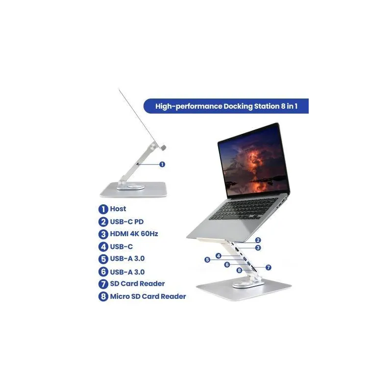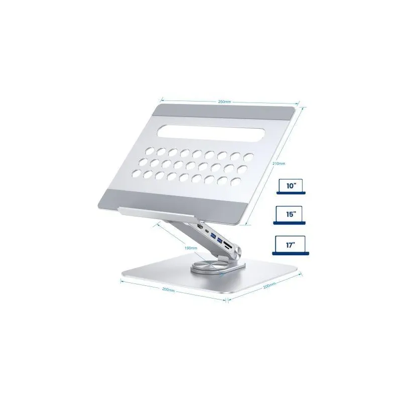 En resumen, este soporte ofrece una combinación única de diseño, ergonomía y conectividad, adaptándose a las necesidades de cualquier usuario moderno. Su construcción en aluminio y silicona garantiza durabilidad y estabilidad, mientras que su capacidad de ajuste y rotación lo hace excepcionalmente versátil. Con múltiples opciones de puerto y un peso ligero, es una solución integral para mejorar la experiencia de uso de cualquier ordenador portátil.