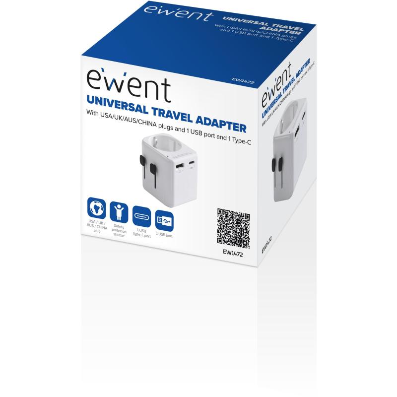 Ewent EW1472 Adaptador de Enchufe Universal de Viaje 1 USB-A y 1 USB-C