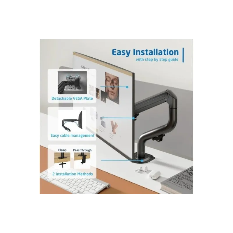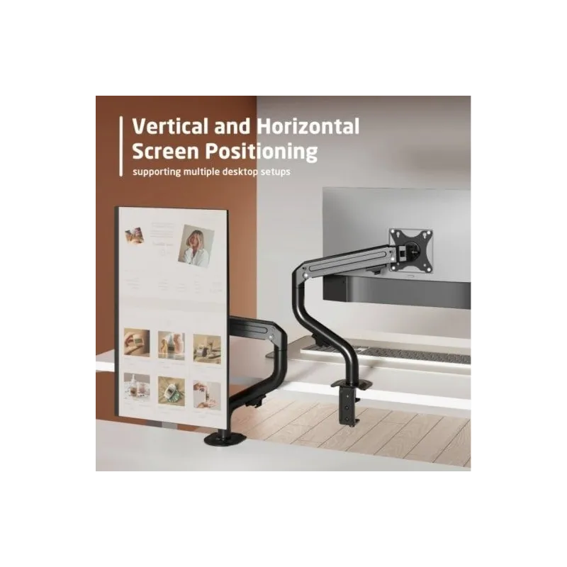 Construido con materiales de alta calidad como aluminio, plástico y acero, y presentado en un elegante color negro, este soporte se integra perfectamente en cualquier configuración de oficina o casa. Su orientación adaptable a paisaje o retrato y la instalación simplificada lo convierten en la elección ideal para profesionales y entusiastas de la tecnología.