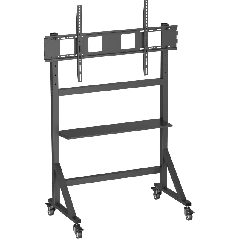 Beneficios clave: ajuste de altura manual, ruedas integradas, bloqueo de ruedas, instalación en suelo, compatible con 55"–100", 1 estante incluido, color negro, materiales de acero y plástico, soporte VESA 200 x 200 mm, soporte VESA 1000 x 600 mm, soporta 1 pantalla, cantidad por paquete 1 pieza(s)